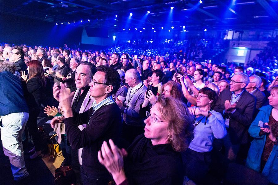 “Get your ass to MARS” reads the message on Buzz Aldrin’s T-shirt at his home in Florida. He gets a standing ovation from a couple of thousand people in the dark auditorium on the other side of the ocean.