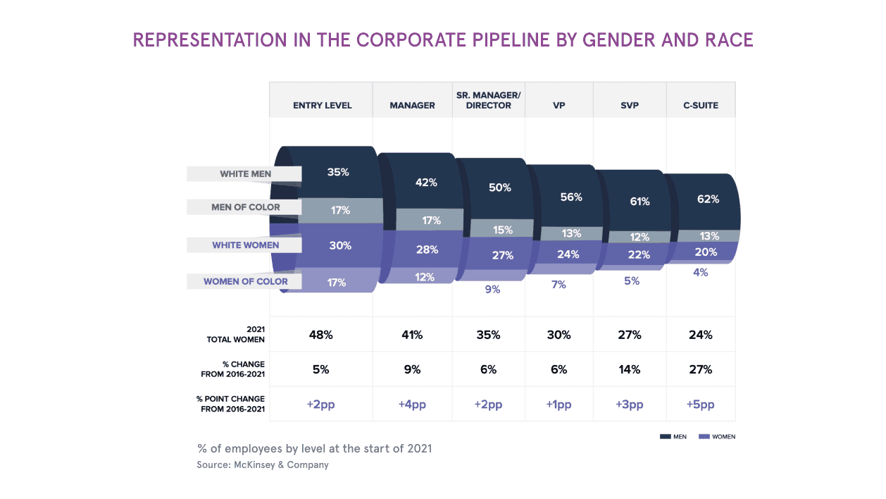 A 2021 McKinsey study shows that the disparity between men and women begins as early as the first promotion opportunity because even though women account for 48% of entry-level hires they only account for 41% of first-level managers.