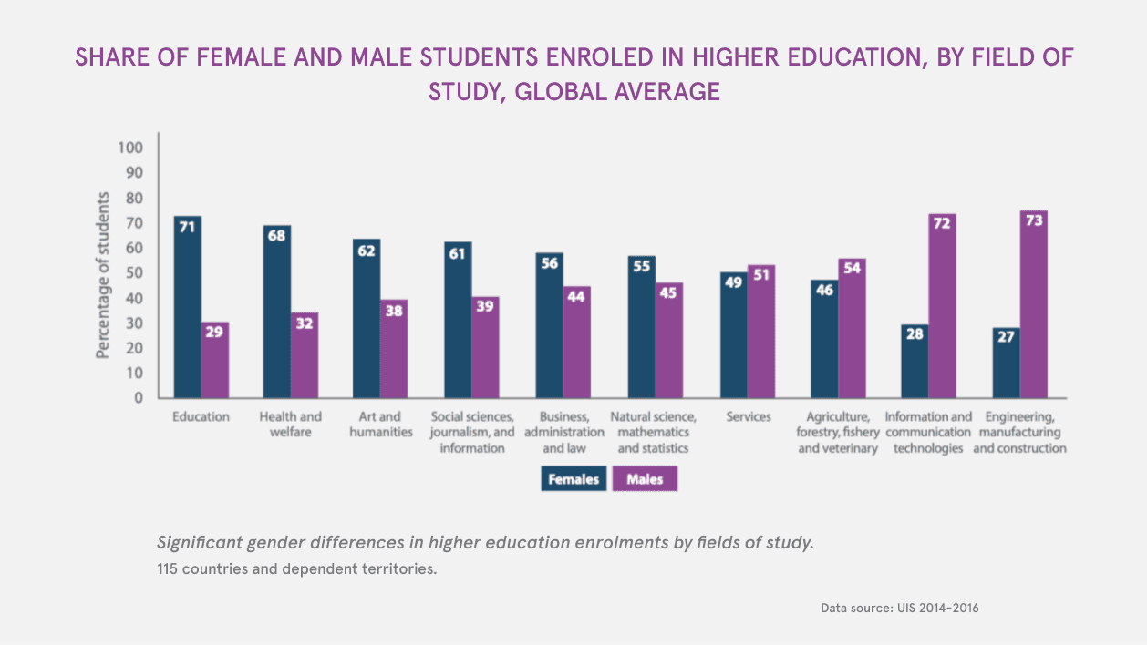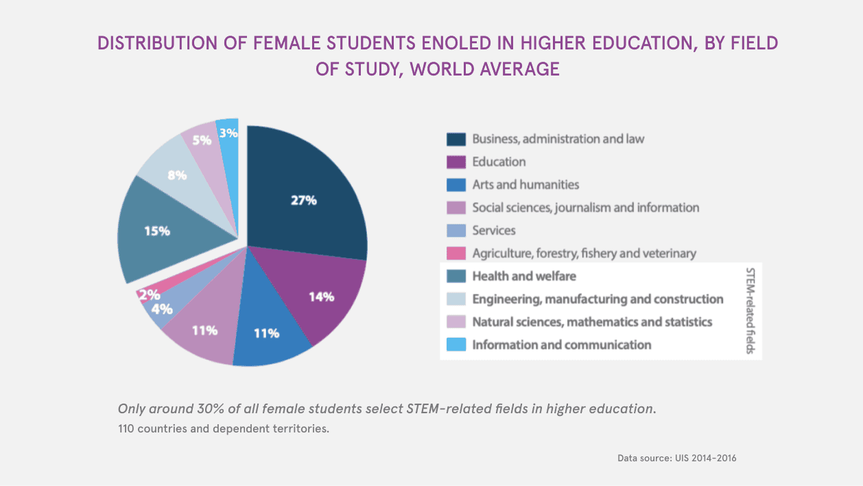 In high-income countries, even though women are more likely than men to enrol and finish a bachelor’s degree (PEW Research), these percentages drop when it comes to computer science, engineering, and physics. Globally, a UNESCO report shows that only 35% of STEM students in higher education are women.