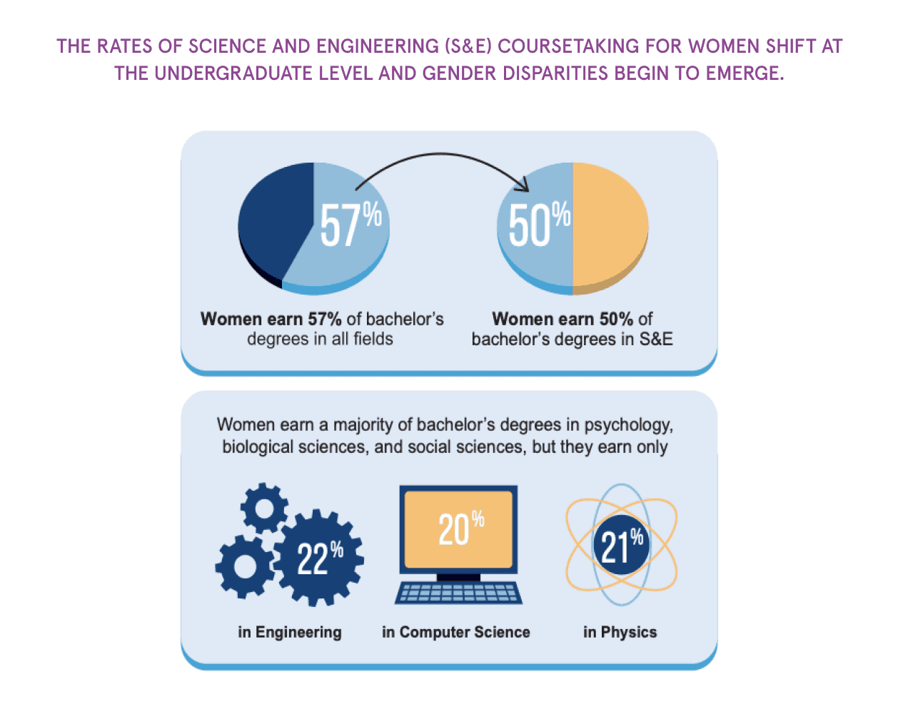 Even before the pandemic, women in STEM careers were more likely to leave their jobs within the first five years. Their reasons include lack of role models, having to deal with a “bro-culture”, feelings of isolation, disparities in salaries and promotions, being judged negatively by their male peers, and sexual harassment (43% of women working in tech experienced harassment).
