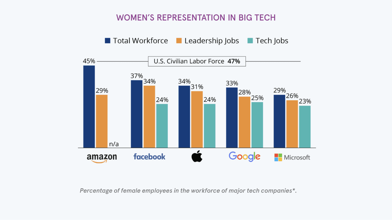 The first gender gap translates to an even bigger chasm in the workforce. According to Gartner's research, only 31% of IT employees are women. Deloitte also calculates that about 33% of the workforce in the global technology firms is composed of women. In 2021, Statista showed that women made up 20-42% of the workforce of the top tech companies (Google, Apple, Meta, Amazon, and Microsoft).
