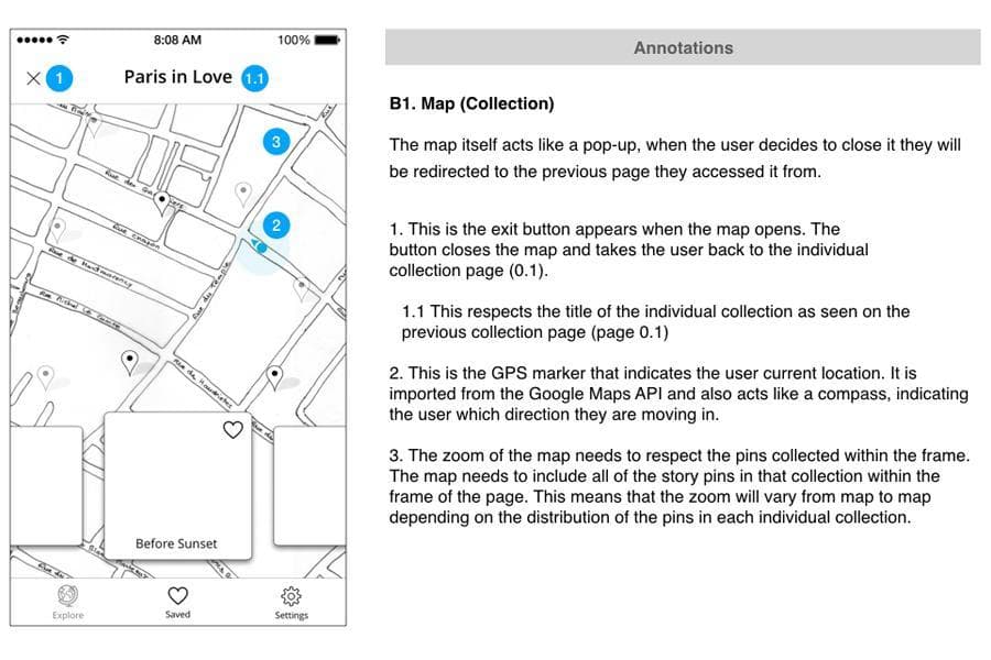 Here is a collection of blocked wireframes. This is an example of high-fidelity wireframes. Annotated Wireframes: Annotations are a written description of what happens when users interact with a product and are added to the wireframes. They explain to clients what happens when a user clicks a button or icon etc. They are used by developers to build your product.