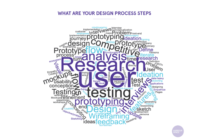 The words Research, User, Analysis, Prototyping and Testing are prominent in the word cloud. Those are the steps of a UX design process that UX designers jointly - and unknowingly - agree upon.